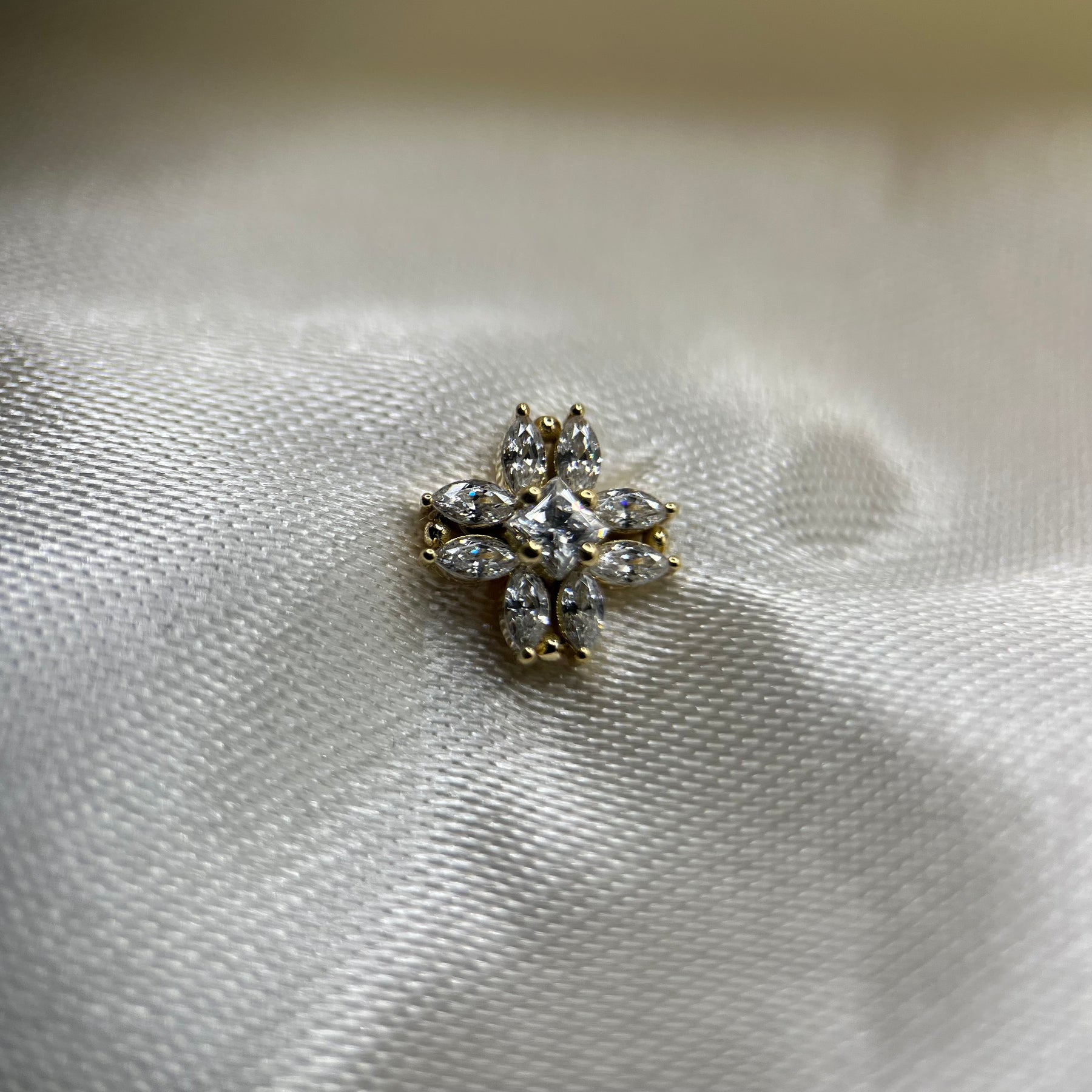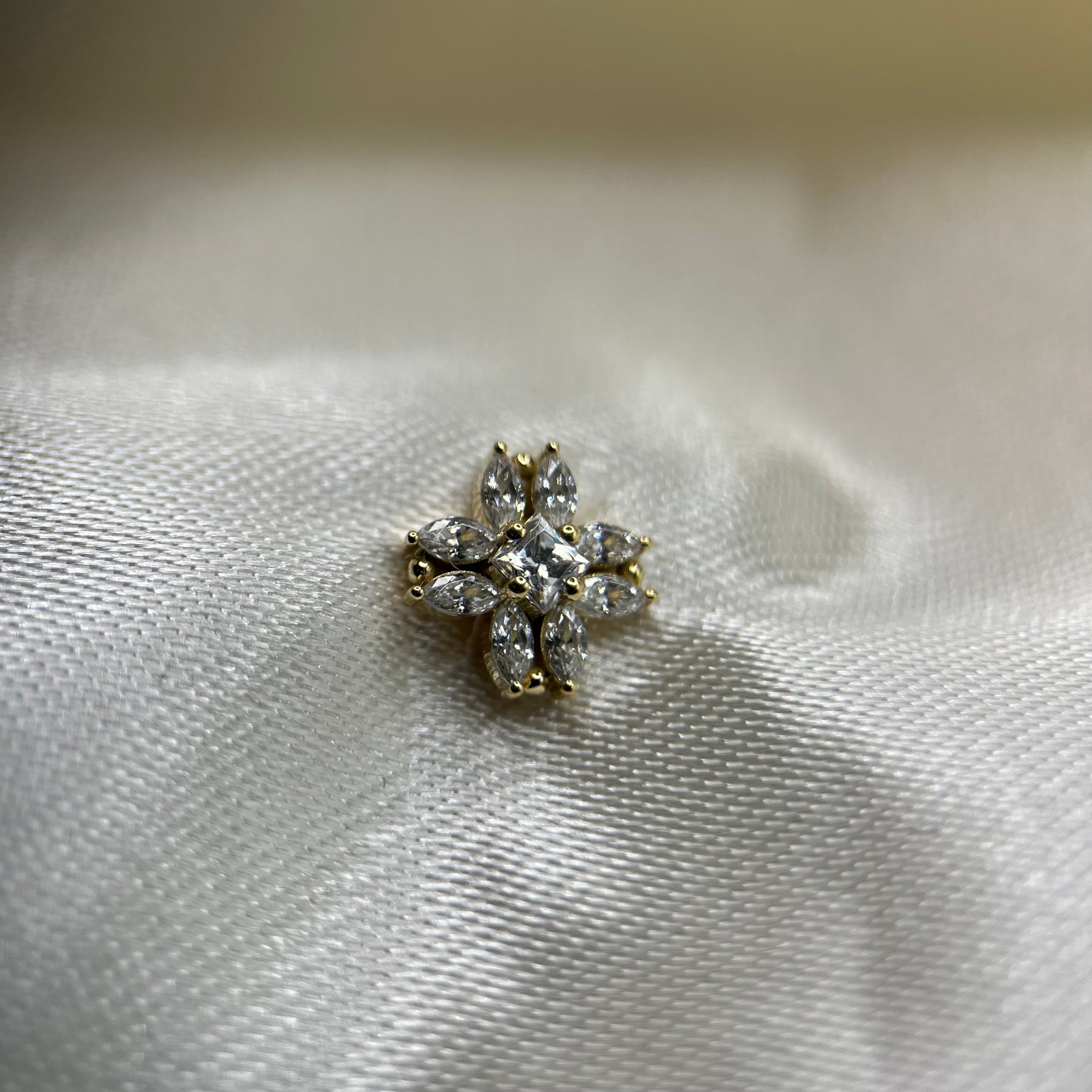 Terminale a filettatura interna in oro giallo 18 karati. Il gioiello presenta diversi zirconi, garantiti a vita sull'incastonatura.