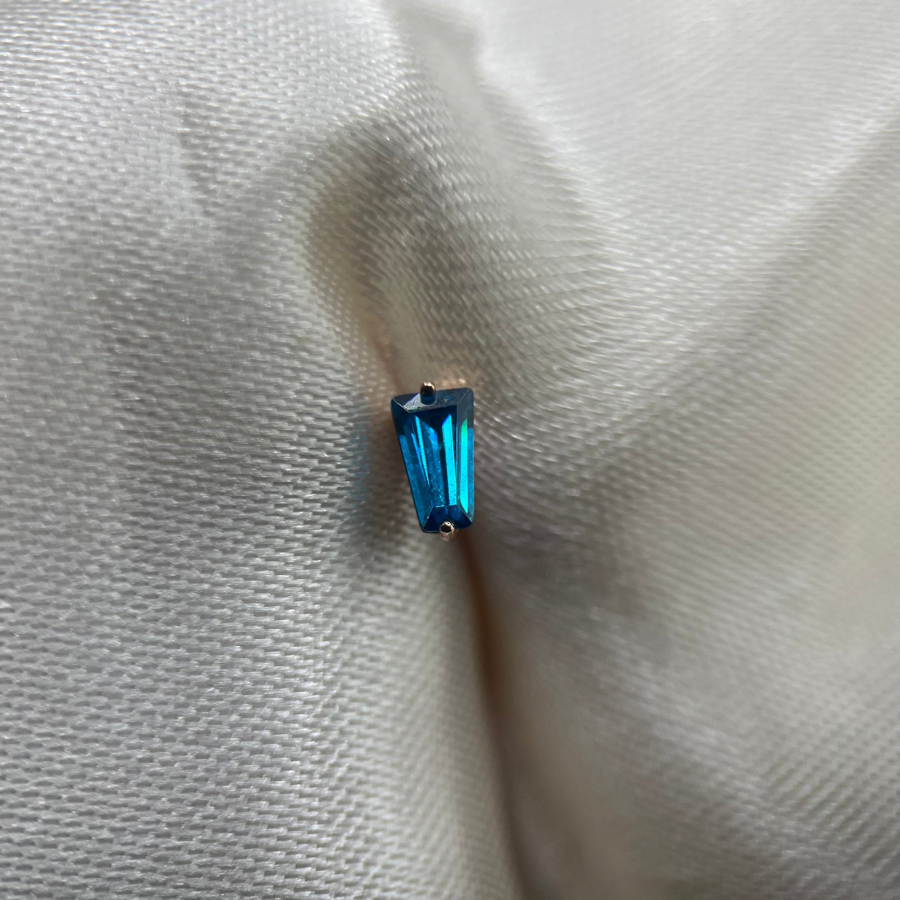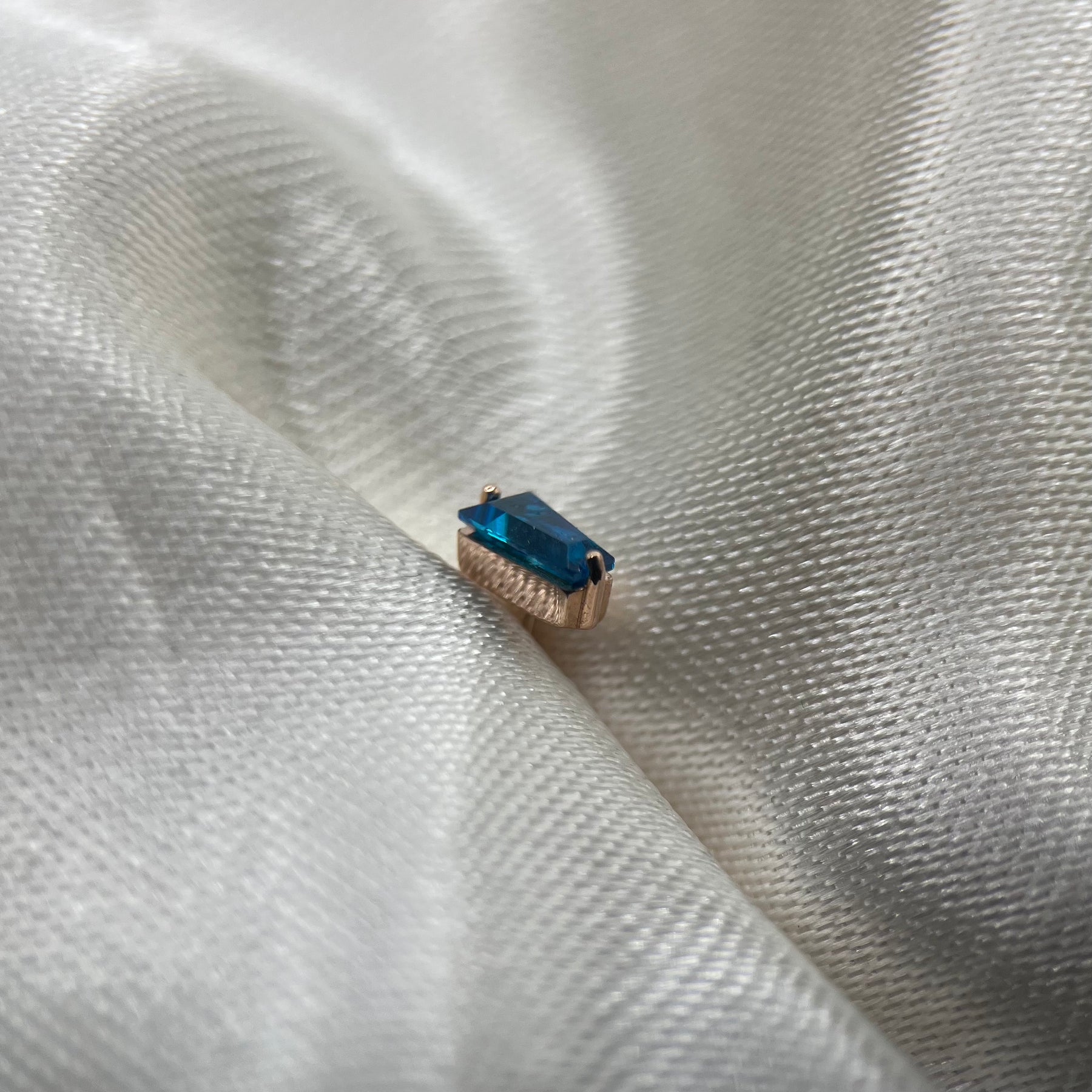 Terminale non filettato in oro 14 karati. Il gioiello è composto da un castone in oro rosa che racchiude uno zircone blu taglio baguette.
